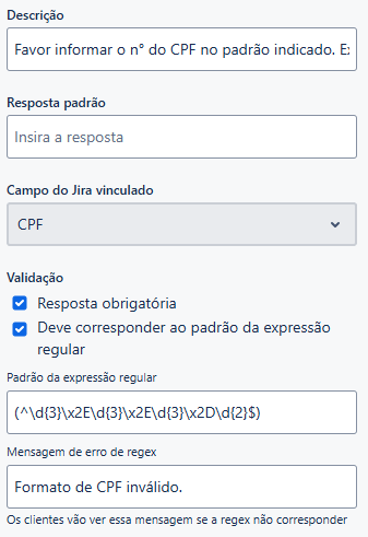 5. Insira a expressão regular (Regex) correspondente, no exemplo abaixo foi utilizado a expressão para o CPF:
