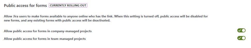 Para garantir o controle da organização sobre o uso dos formulários públicos, a Atlassian liberou duas novas configurações globais: