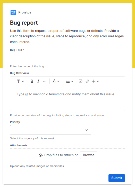 Exemplo: Forms para que os usuários possam reportar bugs no sistema de maneira simples e rápida: