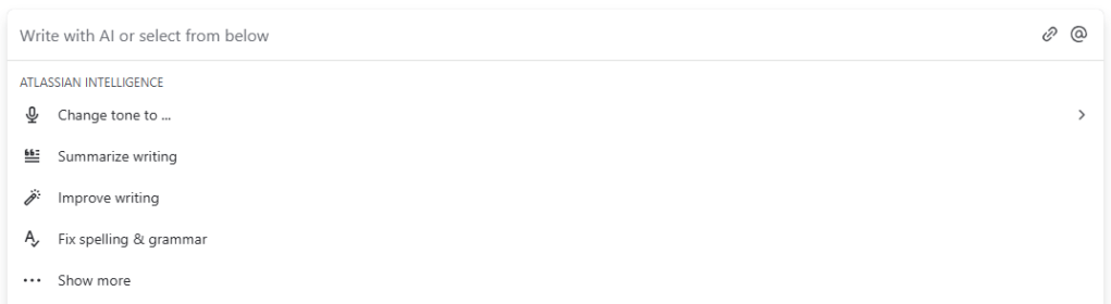 A IA do Confluence também oferece prompts prontos para tarefas comuns, o que reduz o tempo necessário para criar ou organizar conteúdo.