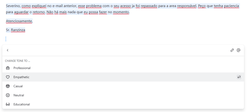 - Alterar o tom → Ajusta o estilo da comunicação (mais formal, amigável, direto etc.).