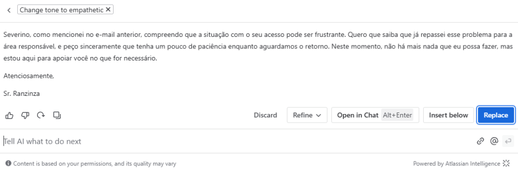 Como podemos ver, a IA da Atlassian, quando aplicada ao Confluence, atua como um verdadeiro assistente de escrita e organização de conhecimento, otimizando desde a criação até a edição de conteúdos e reduzindo drasticamente o tempo gasto em tarefas repetitivas.