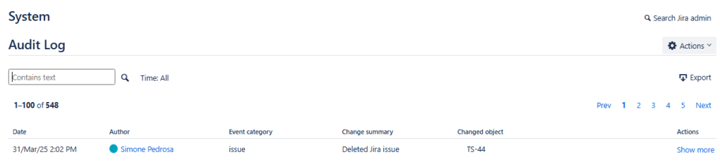 Uma demanda antiga da comunidade que finalmente virou realidade – JRACLOUD-59371 – agora, qualquer exclusão de item será registrada no Audit Log da instância, informando: